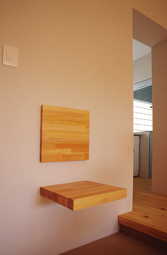 写真4:玄関ベンチ 靴等履かれる際に重宝します。邪魔な足が無いので軽やかな印象です。パインの集成材で出来ています。 |